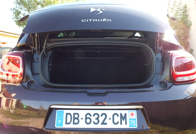 Question chargement, la DS 3 Cabrio a dû céder un peu de son coffre au mécanisme du toit. Le volume reste cependant très correct avec 245 litres. Mais c’est le chargement qui s’avère plus compliqué car l’ouverture du coffre est devenue beaucoup plus étroite. Le volet de coffre se lève à la verticale sur la lunette arrière et dégage une petite ouverture. En même temps, difficile d’imaginer un autre mécanisme. Il a bien fallu faire des sacrifices… Au moins, cela vous apprendra à utiliser des petites valises!