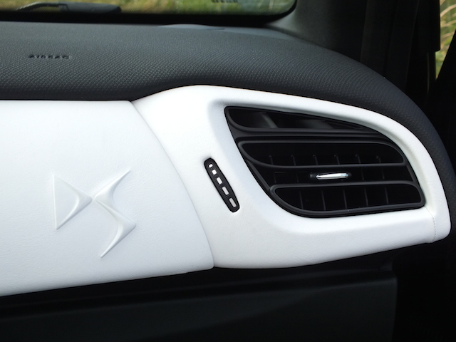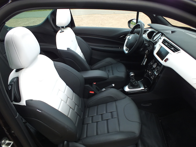 A l’extérieur, la DS 3 nous place immédiatement en présence d’une citadine premium. Mais qu’en est-il à bord? Car sur ce point, sa principale concurrente, la MINI, déçoit. Dans cette finition Ultra Prestige, la DS 3 arbore un intérieur spécifique. D’abord, avec une la magnifique sellerie bracelet –une exclusivité Citroën– bi-ton noir/crème. Un cuir de très bonne facture posé sur des sièges chauffés et à l’excellent maintien latéral. Voilà de quoi plaire. Si le haut de la planche de bord est moussé, cette finition haute remplace également la façade habituelle –personnalisable mais en plastique un peu toc – par le cuir repris des sièges et, qui plus est, affiche le monogramme DS en incrustation. Du plus bel effet!
