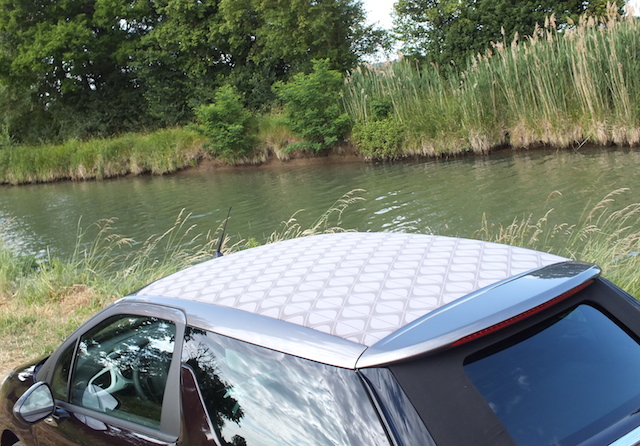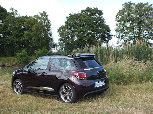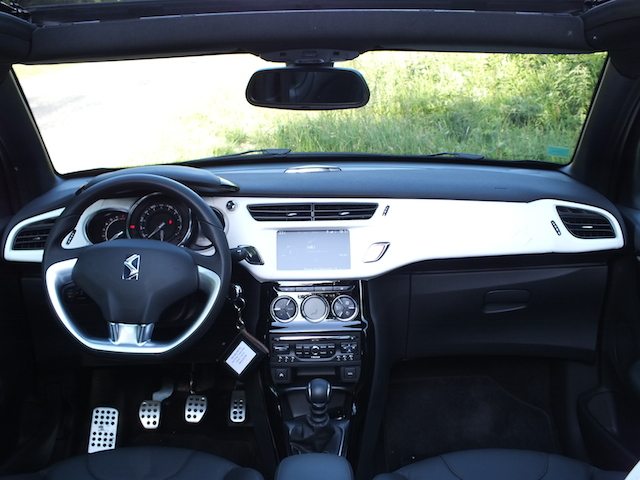 Question cabrio, le toit de la DS 3 permet plusieurs options. Le premier cran d’arrêt permet une ouverture sur une trentaine de centimètres. De quoi bénéficier d’un peu d’air à la manière d’un simple toit ouvrant. Pour plus de sensations et de luminosité, le toit peut aussi s’ouvrir sur toute sa longueur. Cette position est agréable car, en ville ou en manoeuvre, elle garde la lunette arrière –en verre– en place. Pratique! Enfin, pour pleinement profiter du plein air, la capote en toile peut se positionner sur le coffre arrière. De quoi faire entrer encore plus d’air dans l’habitacle, ce qui profite notamment aux passagers arrières qui ont alors l’impression d’être dans un vrai cabriolet. L’inconvénient est qu’alors, vous n’avez plus de visibilité vers l’arrière via le rétroviseur central. Rebutant? Pas vraiment. C’était ma crainte avec avoir lu quelques essais et discuter avec plusieurs journalistes. Au final, cela vous ré-apprend simplement à utiliser plus régulièrement les rétroviseurs latéraux. Personnellement, j’ai roulé majoritairement dans cette configuration. Pas si gênante donc! Seul le bruit, bien entendu, se fait alors plus présent. Mais c’est le prix à payer pour rouler à découvert! En position fermée, le toit en toile préserve une étonnante insonorisation. Il faut dire qu’elle a fait l’objet de toute l’attention de ses concepteurs et est vraiment digne du label premium voulu par Citroën. Question manipulation, il faut seulement 16 secondes pour entièrement capoter ou décapoter. On regrettera juste qu’il n’y ait pas plusieurs boutons afin que la manoeuvre soit automatique… Un détail. Surtout que, contrairement à beaucoup de cabriolet, ce choix de “cabrio” permet de manipuler la capote jusqu’à une vitesse de 120 km/h. Et oui, même sur autoroute, on peut ouvrir. Pratique!