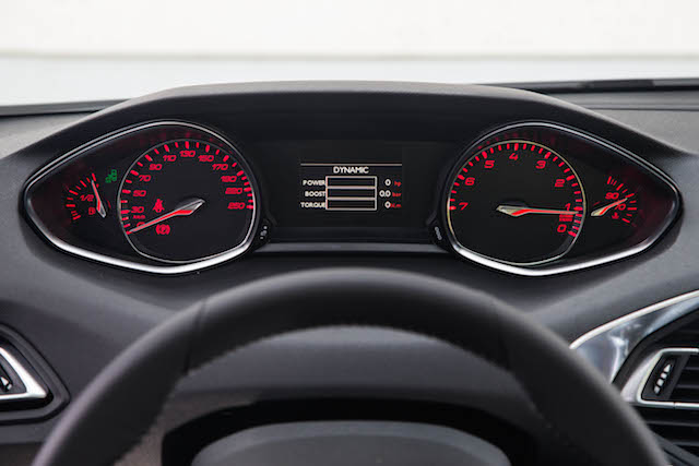 Pour renforcer les sensations de conduite, la 308 SW inaugure également le “Driver Sport Pack”. Une option à 280€ qui “stimule les sens” du conducteur selon Peugeot. En appuyant sur le bouton situé sur la console centrale, la direction se fait plus ferme, la pédale d’accélérateur devient plus réactive tandis que le combiné passe en mode “sport” en changeant sa couleur du blanc vers le rouge. De nouvelles informations apparaissent dans l’ordinateur de bord telle que la puissance délivrée ou la pression de suralimentation. Pour ajouter encore aux sensations, la sonorité du moteur est également amplifiée de manière artificielle grâce à un ampli numérique qui modifie l’acoustique de l’habitacle. Si cette option se montre intéressante -on apprécie notamment la meilleure réactivité de l’accélérateur ou la direction plus incisive-, on regrette de ne pas pouvoir la paramétrer. On supprimerait alors l’amplification moteur qui devient vite agaçante, particulièrement sur le 1.2 THP qui a déjà une sonorité bien à lui. Néanmoins, saluons le côté fun de cette option.