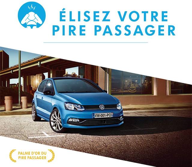 Je vous présentais il y a quelques jours la campagne de communication de la nouvelle Polo qui fait “place à la confiance”. Une campagne qui notamment en avant les nombreuses aides à la conduite de la nouvelle Polo en se moquant du pire passager, celui qui vous agace et aimerait conduire à votre place. Volkswagen surfe aujourd’hui sur cette thématique pour lancer sur Facebook l’élection du Pire Passager! Le principe est plutôt simple. Vous vous connectez à l’application proposée par VW sur Facebook et vous choisissez parmi vos amis quel est celui qui est ou a été votre Pire Passager. Ensuite, vous choisissez parmi des propositions la remarque qu’il fait le plus, vous voter et partager le tout! De quoi bien rigoler avec vos amis …. ou créer quelques tensions! Bien entendu, VW vous propose des cadeaux à la clé dont, notamment, l’essai de la nouvelle Polo pendant une semaine! Pour jouer, c’est par ici et c’est jusqu’au 26 juin!