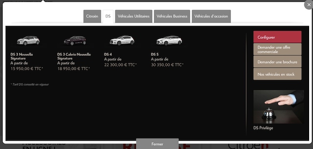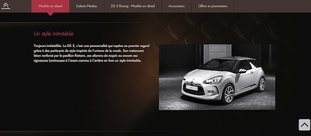 Totalement responsive –je l’ai testé sur pc, mac, tablette et smartphone avant de vous en parler!– le nouveau site des chevrons conjugue deux autres qualités essentielles sur un site web. Une belle mise en valeur graphique des produits alliée à des textes concis comme ci-dessous pour DS3 Nouvelle Signature.