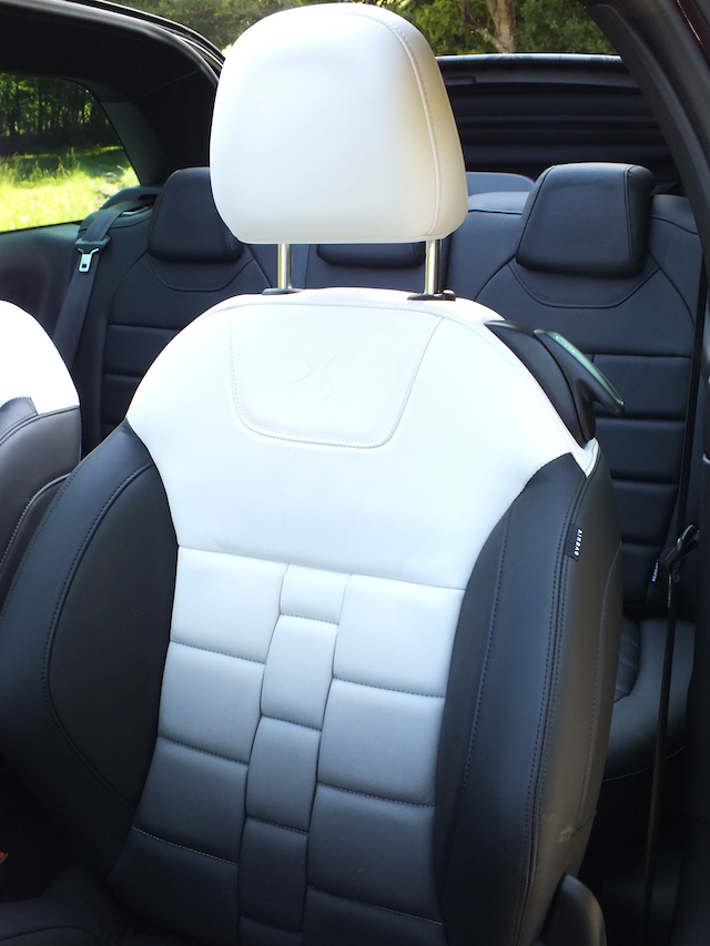 Question cabrio, le toit de la DS 3 permet plusieurs options. Le premier cran d’arrêt permet une ouverture sur une trentaine de centimètres. De quoi bénéficier d’un peu d’air à la manière d’un simple toit ouvrant. Pour plus de sensations et de luminosité, le toit peut aussi s’ouvrir sur toute sa longueur. Cette position est agréable car, en ville ou en manoeuvre, elle garde la lunette arrière –en verre– en place. Pratique! Enfin, pour pleinement profiter du plein air, la capote en toile peut se positionner sur le coffre arrière. De quoi faire entrer encore plus d’air dans l’habitacle, ce qui profite notamment aux passagers arrières qui ont alors l’impression d’être dans un vrai cabriolet. L’inconvénient est qu’alors, vous n’avez plus de visibilité vers l’arrière via le rétroviseur central. Rebutant? Pas vraiment. C’était ma crainte avec avoir lu quelques essais et discuter avec plusieurs journalistes. Au final, cela vous ré-apprend simplement à utiliser plus régulièrement les rétroviseurs latéraux. Personnellement, j’ai roulé majoritairement dans cette configuration. Pas si gênante donc! Seul le bruit, bien entendu, se fait alors plus présent. Mais c’est le prix à payer pour rouler à découvert! En position fermée, le toit en toile préserve une étonnante insonorisation. Il faut dire qu’elle a fait l’objet de toute l’attention de ses concepteurs et est vraiment digne du label premium voulu par Citroën. Question manipulation, il faut seulement 16 secondes pour entièrement capoter ou décapoter. On regrettera juste qu’il n’y ait pas plusieurs boutons afin que la manoeuvre soit automatique… Un détail. Surtout que, contrairement à beaucoup de cabriolet, ce choix de “cabrio” permet de manipuler la capote jusqu’à une vitesse de 120 km/h. Et oui, même sur autoroute, on peut ouvrir. Pratique!
