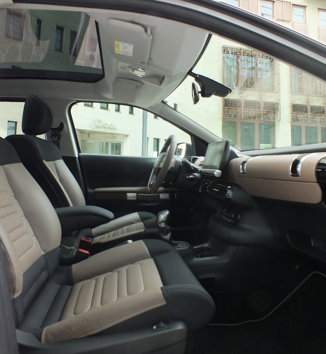 Très épurée, la planche de bord affiche un vaste rangement face au passager. Pour cela, Citroën a libéré l’espace en innovant par l’intégration de l’airbag dans le pavillon. Voilà de quoi offrir une boite à gant généreuse et pratique qui s’ouvre vers le haut. Cette dernière peut-être dotée de motifs rappelant la maroquinerie, à l’instar des jolies lanières d’ouverture/fermeture des portes. C’est très joli et valorisant, tout comme les harmonies intérieures qui peuvent être de couleur brune, violette ou grise. Des couleurs qui se retrouvent sur la belle sellerie qui recouvre des sièges très confortables. D’ailleurs, lorsque la C4 Cactus s’équipe de la boite de vitesses robotisée ETG6, les deux sièges avants sont reliés par une troisième pièce en tissus afin d’évoquer un sofa comme au temps de la banquette avant des anciennes Citroën. Très élégant, même si on apprécie alors surtout l’accoudoir très confortables qui équipe ces versions, bien plus agréable que le banal accoudoir -repris de la 208- des version à boite manuelle. Si Citroën a soigné la planche de bord, le constructeur indique clairement avoir favorisé les endroits où les yeux et les mains se posent régulièrement. Ainsi, sur les contre-portes et au bas de la console, Citroën fait appel à un plastique très bas de gamme. Heureusement, la finition n’appelle pas la critique même si plusieurs détails agacent comme la finesse de la moquette ou encore l’absence de celle-ci dans une partie du coffre. Une économie de bout de chandelle plutôt mal venue, comme l’absence de miroir de courtoisie sur le pare-soleil passager! Bref, si l’ensemble est plutôt valorisant, le très chic côtoie parfois le très cheap…