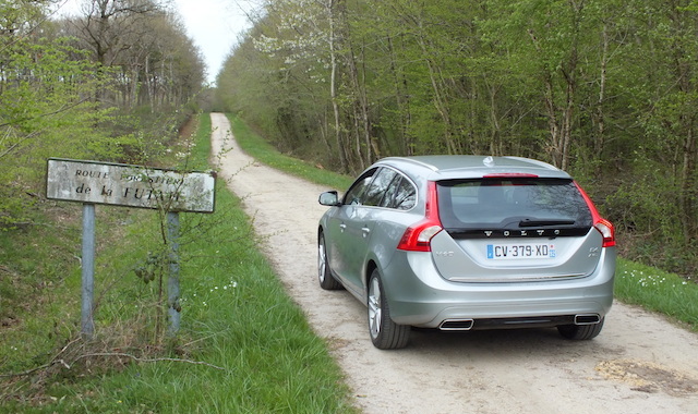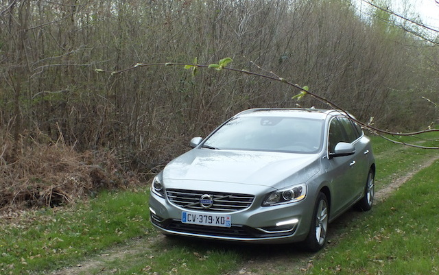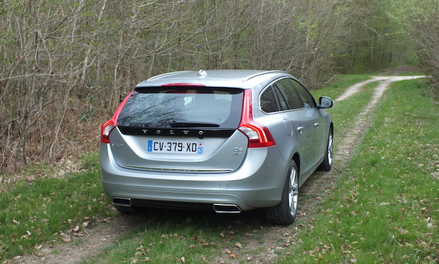 Si ce petit coffre pourra décevoir, n’oublions pas que l’innovation majeure de ce break prend place sous son capot et son architecture technique. Le V60 Plug-in Hybrid, premier hybride rechargeable diesel, affiche en effet sur le papier des caractéristiques étonnantes. Pour le côté écolo, on retiendra 48g de CO2/km. Pour l’économie, une autonomie en tout électrique de 50 km et le fait qu’il puisse recharger en quelques heures seulement sur une simple prise de courant son moteur électrique de 68 ch. Pour la sécurité, le fait qu’il puisse être 4 roues motrices (traction thermique couplée à la propulsion arrière électrique des roues arrières) comme nous le signale d’ailleurs Volvo sur le hayon arrière avec la mention AWD. Et pour la performance, le moteur 5 cylindres diesel D6 de 215 ch -déjà une belle valeur- puissance qui pourra être portée à 280 ch avec l’apport de la propulsion électrique. Voilà un cocktail qui s’annonce séduisant, le tout accompagné d’une boite automatique classique Geartronic à 6 rapports. Pour découvrir tout cela, il convient d’utiliser le commutateur des trois modes –Pure, Hybrid, Power– situé sur la console centrale. C’est ce que nous avons donc fait 🙂