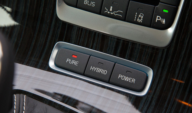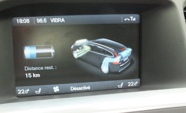 C’est le mode que vous allez le plus fréquemment utilisé. Passés les premiers kilomètres de roulage en tout électrique, vous aurez bien entendu besoin du moteur thermique D6 pour mouvoir les 1900 kg de ce break : ce dernier entrera en fonction dès que cela devient nécessaire. Vous disposez alors d’un break confortable à la puissance agréable de 215 chevaux! De quoi permettre des performances très honorables tout en affichant une consommation moyenne de 4,5l sur un parcours routier de 70 km avec un départ en ville de 10 km environ. C’est moins bien qu’annoncé -1,8 l/100 km- mais une valeur plus qu’honorable compte-tenu de la puissance et du poids du modèle. Le mode hybrid est le mode par défaut au démarrage du V60 PiH car il gère seul l’utilisation électrique/thermique nécessaire au conducteur. Vous l’apprécierez donc au quotidien surtout qu’il est parfaitement épaulé par la boite automatique à 6 rapports Geartronic. C’est là qu’on voit tout le travail effectué par les ingénieurs de Volvo : le passage de l’électrique au thermique et vice-versa se fait dans une douceur absolue. Aucun à-coup, aucun manque de puissance ou de réactivité, on reste bluffé par la discrétion du système et le travail effectué par la boite de vitesses. On est très loin –et très au-dessus en terme d’agrément– de la boite de vitesses robotisée des Hybrid4 Peugeot Citroën –qui utilise par ailleurs une propulsion hybride assez similaire– ou encore de l’archaïque variateur d’une Toyota Prius! Sur autoroute, vous pourrez également choisir de recharger un peu votre autonomie électrique (environ 15 km) en passant en mode Save. Alors, seul le moteur thermique fonctionne et recharge également les batteries électriques. Mais attention, la consommation fait alors un bond de 30%! C’est aussi sur autoroute que vous apprécierez le plus la panoplie d’aides électroniques déployées par le V60 Plug-In Hybrid : le régulateur adaptateur bien sûr, mais aussi le BLIS (détection dans l’angle mort), l’aide au franchissement involontaire de ligne ou encore les feux de route permanents. Entendez par là que le véhicule reste toujours en “plein phare”. Lorsque vous croisez un véhicule, le système obscurcit la partie qui éblouit habituellement l’autre conducteur. Un système comme toujours avec Volvo très efficace… mais aussi très déroutant au début!