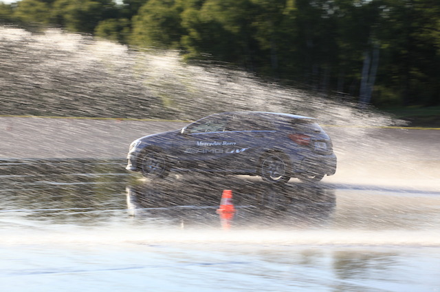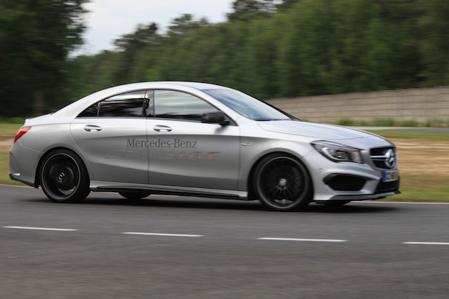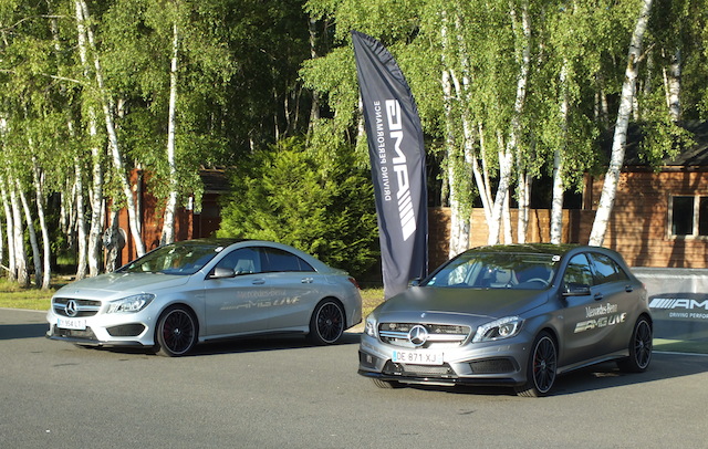 Premier atelier : tester la motricité sur sol mouillé et les réactions dynamiques des modèles. A notre disposition : A 45 AMG et CLA 45 AMG. J’opte pour le second qui affiche, à mes yeux, une esthétique proche de la perfection. Première impression en montant à bord : l’atmosphère basse et confiné du modèle avec des surfaces vitrées étroites nous plonge parfaitement dans une ambiance sportive. Le moteur ronronne et les premiers rapports s’enchainent via la boite automatique ultra réactive. Qu’importe les exercices réalisés sur l’aire plane, le CLA se comporte à merveille. Sur sol mouillé, le train arrière vient épauler les roues avants et on garde la trajectoire même dans un virage serré à plus de 90 km/h. Bluffant! En guise de mise en jambe, on emmène alors le CLA 45 AMG se dégourdir les roues sur le circuit routier du CERAM qui nous servira plus tard de terrain de jeu.