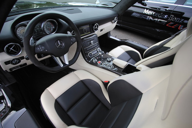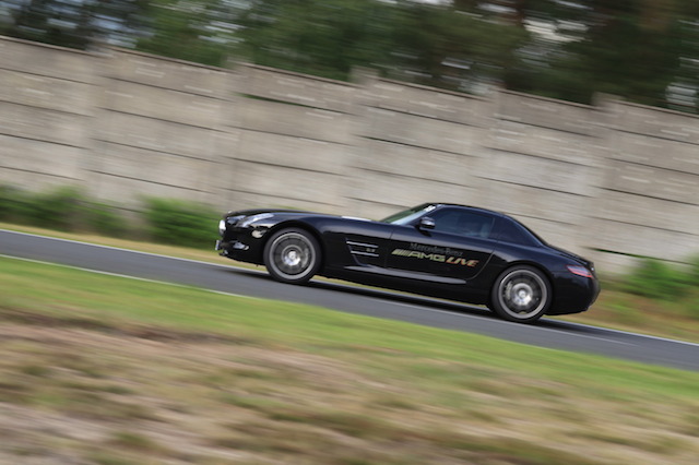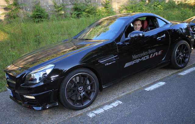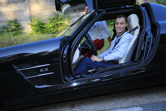 Sur le circuit routier, il faut savoir garder le meilleur pour la fin. La SLS AMG nous attend… Déjà un mythe sur roue, cette voiture m’avait particulièrement impressionné lors de sa sortie en 2010. Une sorte de concept-car que, quelques passionnés – qui a dit fous?– chez Mercedes AMG ont poussé vers la série. Un design exceptionnel avec des portes papillons, hommage à la 300 SL des année 1950, contribuera sans aucun doute au fait qu’elle va devenir une légende. Doté du fameux V8 6,2l -qui tirera bientôt sa révérence-, elle annonce une vitesse max de 317 km/h (limitée électriquement), une puissance de 571 ch et un 0 à 100 en 3,7 secondes. Disons-le clairement, on passe là dans le monde des super cars. Disons-le encore, la première chose qui me vient à l’esprit en montant à bord c’est que je pourrai dire plus tard – et même aujourd’hui– que je vais partie des rares chanceux au monde à l’avoir conduit. On réalise alors l’honneur qui nous est accordé par Mercedes de nous donner cette occasion unique. On prend aussi le temps de découvrir cet intérieur somptueux que ce soit en terme de dessin comme de finition. Chaque détail est soigné, et l’atmosphère à la fois épurée, sportive et luxueuse. On cherche aussi du regard le bout de ce long capot qui s’étend devant nos yeux tandis qu’on constate qu’on est assis très près du sol.